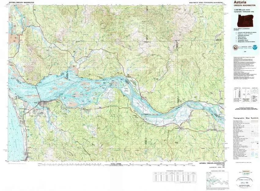USGS 1:100,000 topographic map of Astoria, WA/OR. This map scale is a good for getting a sense of the layout of a larger area of land - it shows an area of about 46 miles by 34 miles. It primarily shows natural features and contour lines, but it will also show towns, section, township & range and some roads.
