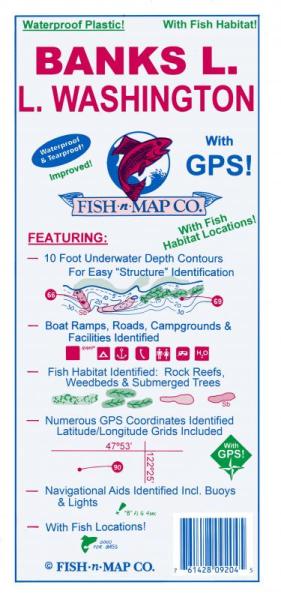 The maps feature information on fish species and suggested fishing locations. Boat ramp locations, fuel, lodging, campgrounds, and grocery stores are marked on the map, as well as RV hookups, showers and restrooms. The fishing maps are printed on both sides for maximum scale and readability.
