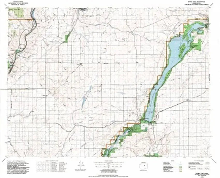 USGS 1:100,000 topographic map of Banks Lake. This map scale is a good for getting a sense of the layout of a larger area of land - it shows an area of about 46 miles by 34 miles. It primarily shows natural features and contour lines, but it will also show towns, section, township & range and some roads.