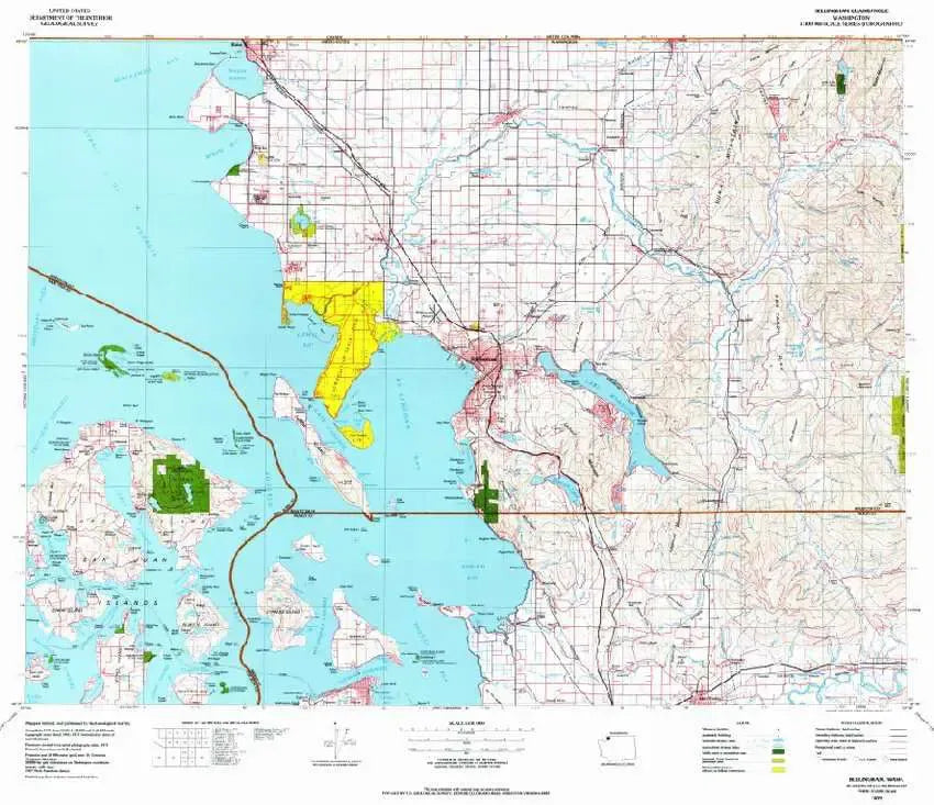 USGS 1:100,000 topographic map of the Bellingham area. This map scale is a good for getting a sense of the layout of a larger area of land - it shows an area of about 46 miles by 34 miles. It primarily shows natural features and contour lines, but it will also show towns, section, township & range and some roads.