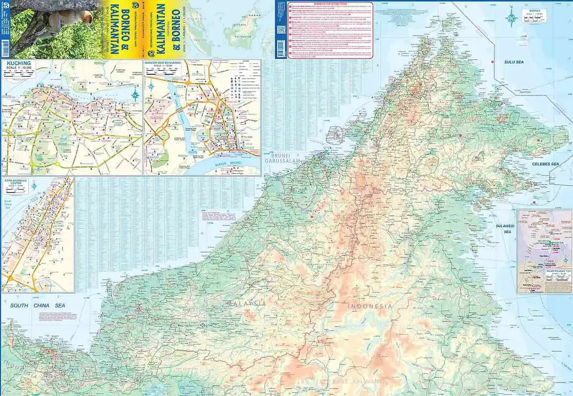 Borneo Road & Travel Map ITMB: Explore the unique and diverse landscapes of Borneo with ITMB’s double-sided, folded travel map, perfectly scaled at 1:100,000 & 1:1,400,000. The front side of this map highlights the northern part of the island, featuring Malaysian Sabah and Sarawak, along with Brunei. Discover iconic locations like Kota Kinabalu, known for its bustling waterfront and gateway to Mount Kinabalu, Malaysia’s tallest peak. This Borneo Road & Travel Map includes insets of Kuching, the capital of Sarawak, celebrated for its cultural heritage, and Bandar Seri Begawan, Brunei’s capital, where stunning mosques and palaces captivate visitors.