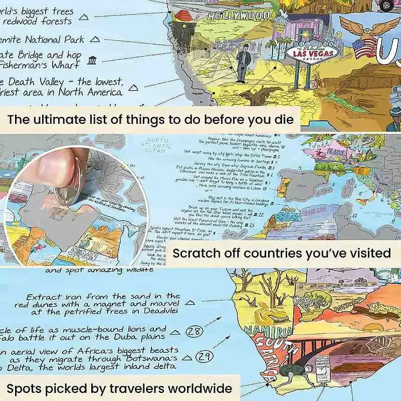 Beneath the silver surface of this Scratch Map lies a vividly illustrated world, showcasing a curated selection of the planet's most iconic landmarks and breathtaking sites. From the Eiffel Tower to the Great Barrier Reef, the underlying layer transforms this map into a work of art, capturing the essence of each location with vibrant colors and intricate details. It's not just a map; it's an aesthetic celebration of the world's wonders.