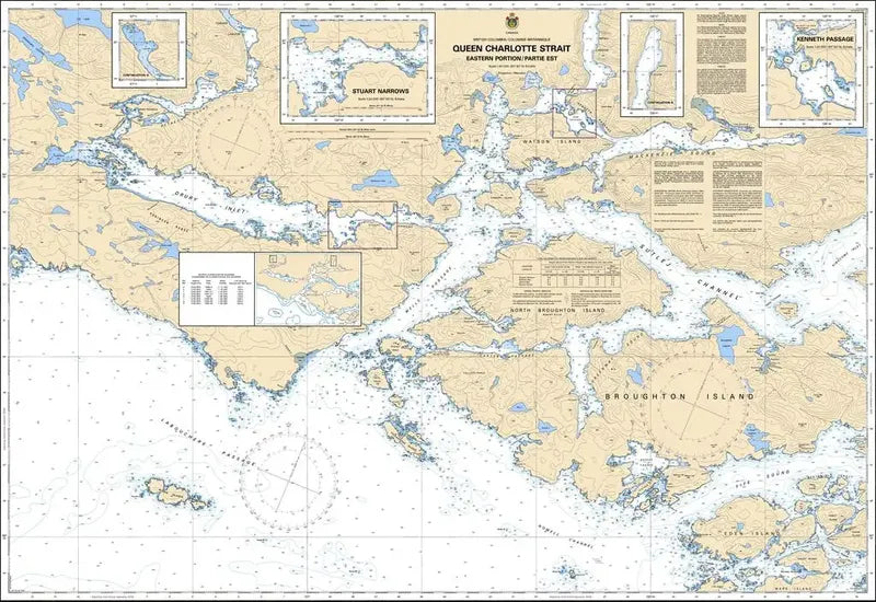 This official Canadian chart details key features such as Queen Charlotte Strait (the Eastern Portion) Broughton Island, Drury Inlet, North Broughton Island, Sutlej Channel, Eden Island and more.
