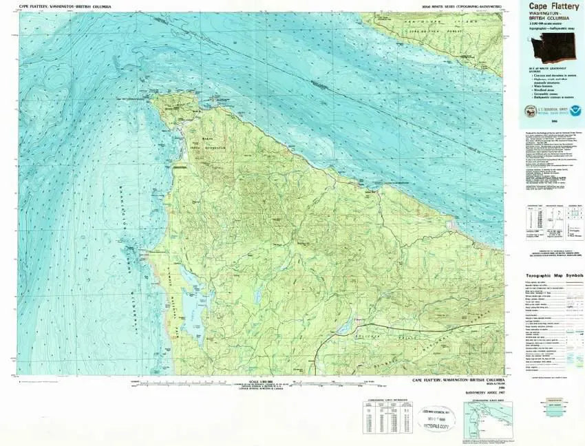USGS 1:100,000 topographic map of Cape Flattery. This map scale is a good for getting a sense of the layout of a larger area of land - it shows an area of about 46 miles by 34 miles. It primarily shows natural features and contour lines, but it will also show towns, section, township & range and some roads.
