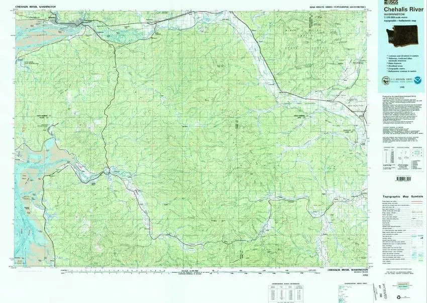 USGS 1:100,000 topographic map of Chehalis River. This map scale is a good for getting a sense of the layout of a larger area of land - it shows an area of about 46 miles by 34 miles. It primarily shows natural features and contour lines, but it will also show towns, section, township & range and some roads.