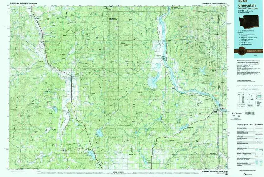 USGS 1:100,000 topographic map of Chewelah. This map scale is a good for getting a sense of the layout of a larger area of land - it shows an area of about 46 miles by 34 miles. It primarily shows natural features and contour lines, but it will also show towns, section, township & range and some roads.