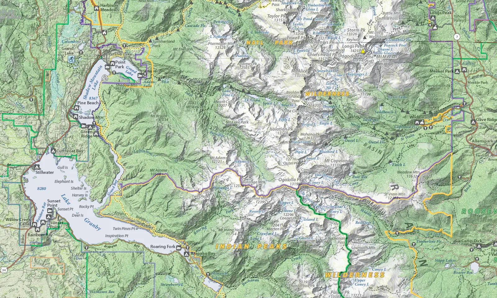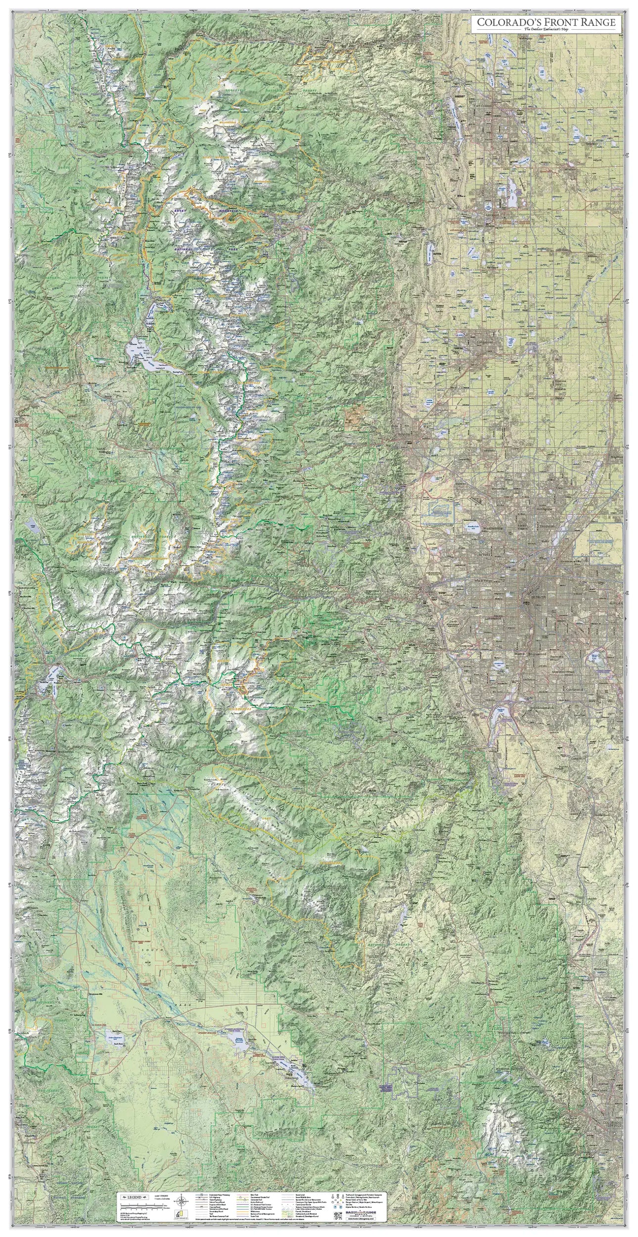 This map covers the Front Range from Fort Collins to Colorado Springs (from the Cache la Poudre Wild and Scenic River to Pikes Peak). It encompasses the southern Medicine Bow Mountains, Mummy Range, Never Summer Mountains, and Rocky Mountain National Park. From east to west it covers from Aurora to Breckenridge.
