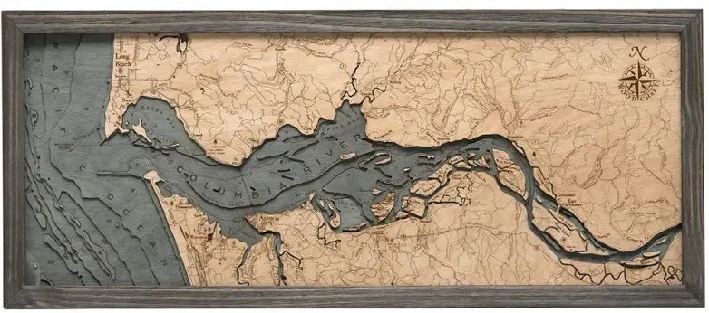 Columbia River Mouth 3D Nautical Wood Chart production process: Each 31" x 13.5" chart begins with precise depth measurements from a bathymetric chart. Skilled artists then laser cut high-quality birch wood into pieces, layering and gluing them to accurately depict the varying depths and dimensions of the waterways. The water areas are meticulously hand-stained, while place names, points of interest, roads, and depths are intricately engraved into the surface. The chart is finished with a custom-sized wood frame and protected by a durable piece of acrylic glass, ensuring its longevity and your continued enjoyment.