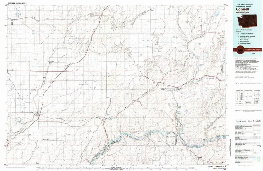 USGS 1:100,000 topographic map of Connell. This map scale is a good for getting a sense of the layout of a larger area of land - it shows an area of about 46 miles by 34 miles. It primarily shows natural features and contour lines, but it will also show towns, section, township & range and some roads.