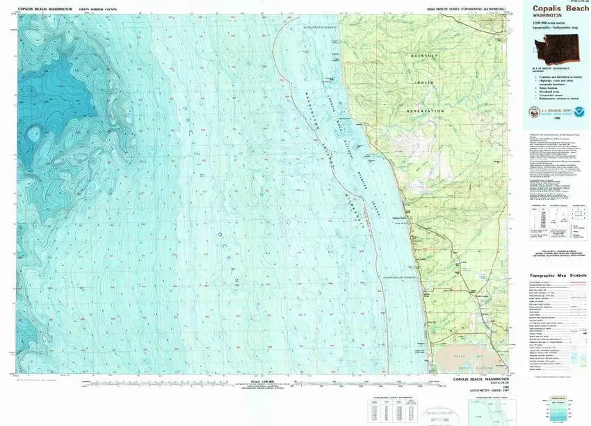 USGS 1:100,000 topographic map of Copalis Beach. This map scale is a good for getting a sense of the layout of a larger area of land - it shows an area of about 46 miles by 34 miles. It primarily shows natural features and contour lines, but it will also show towns, section, township & range and some roads.
