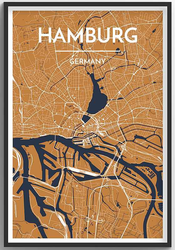 City map graphic print of Hamburg, Germany printed on semi-gloss cardstock. A unique, but simplistic map of Hamburg - ideal for framing!