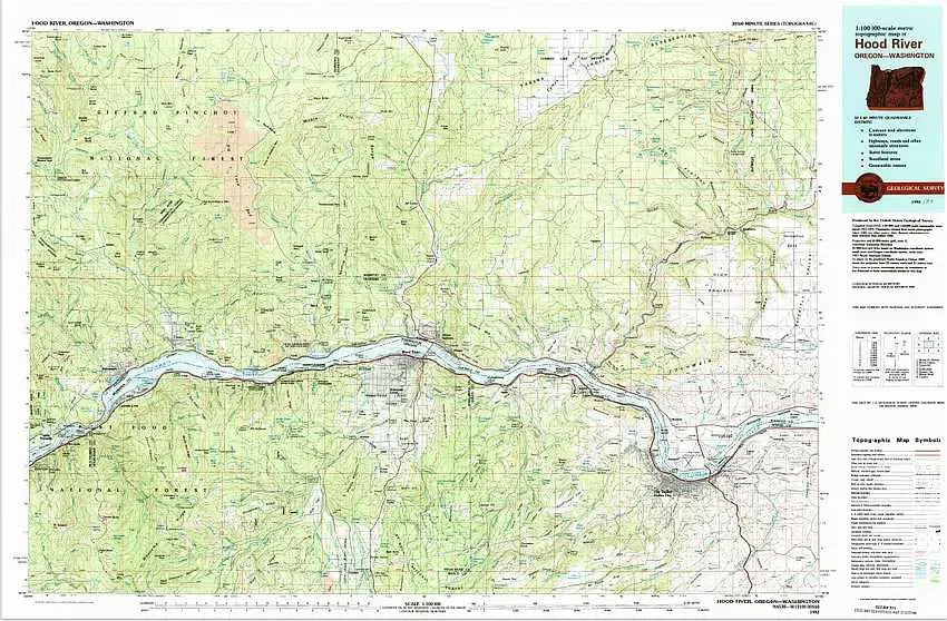 USGS 1:100,000 topographic map of Hood River. This map scale is a good for getting a sense of the layout of a larger area of land - it shows an area of about 46 miles by 34 miles. It primarily shows natural features and contour lines, but it will also show towns, section, township & range and some roads.