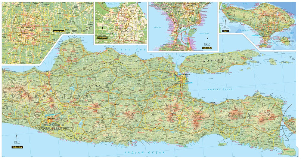 This Java and Bali Travel Road Map includes various insets with differing scales: