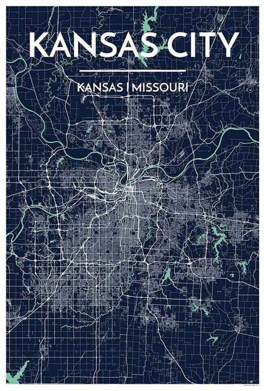 City map print of Kansas City printed on semi-gloss cardstock. A unique, but simplistic map of Kansas City - ideal for framing!