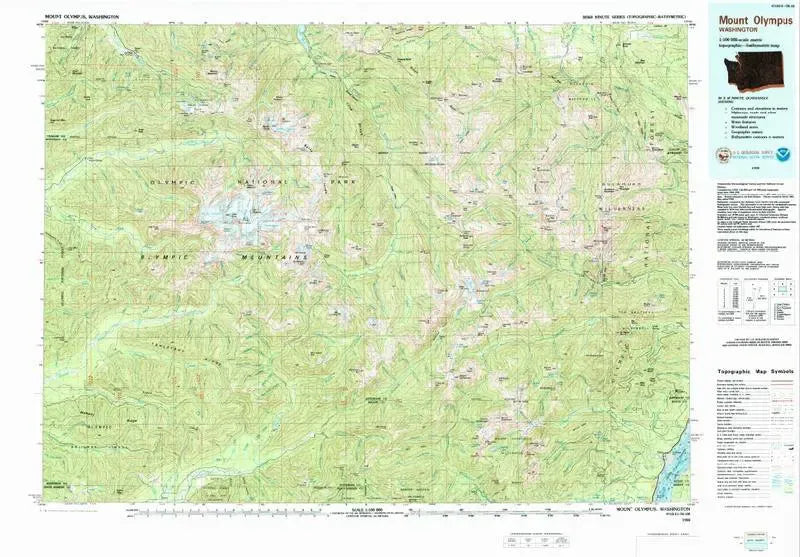USGS 1:100,000 topographic map of Mount Olympus. This map scale is a good for getting a sense of the layout of a larger area of land - it shows an area of about 46 miles by 34 miles. It primarily shows natural features and contour lines, but it will also show towns, section, township & range and some roads.