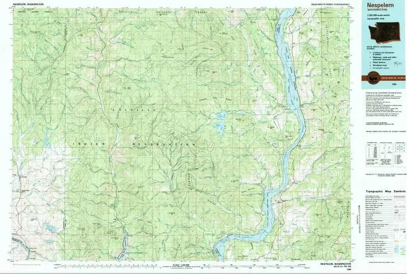 USGS 1:100,000 topographic map of Nespelem. This map scale is a good for getting a sense of the layout of a larger area of land - it shows an area of about 46 miles by 34 miles. It primarily shows natural features and contour lines, but it will also show towns, section, township & range and some roads.