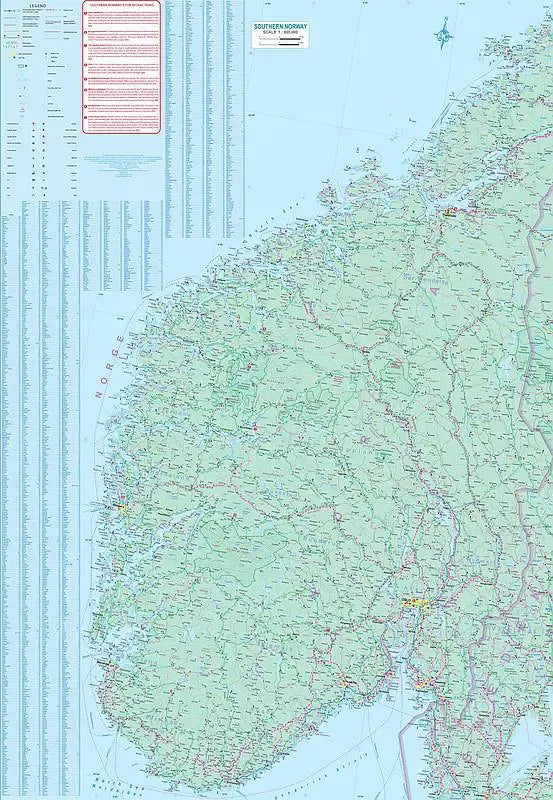 As you unfold the map, immerse yourself in the dynamic essence of Oslo and Bergen, the heartbeats of Norwegian culture. Explore the top tourist destinations in Oslo – such as the majestic Viking Ship Museum, where history comes alive through ancient vessels, or the iconic Vigeland Park, adorned with over 200 sculptures capturing the human experience. Southern Norway, beautifully mapped on the reverse, beckons with its scenic splendor, and the map ensures you don't miss the renowned attractions that make it a must-visit region.