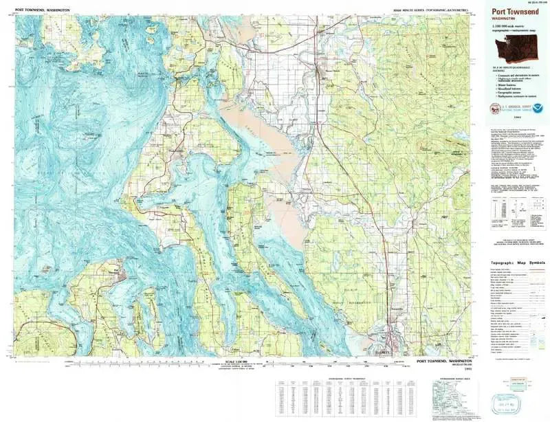 USGS 1:100,000 topographic map of Port Townsend. This map scale is a good for getting a sense of the layout of a larger area of land - it shows an area of about 46 miles by 34 miles. It primarily shows natural features and contour lines, but it will also show towns, section, township & range and some roads.