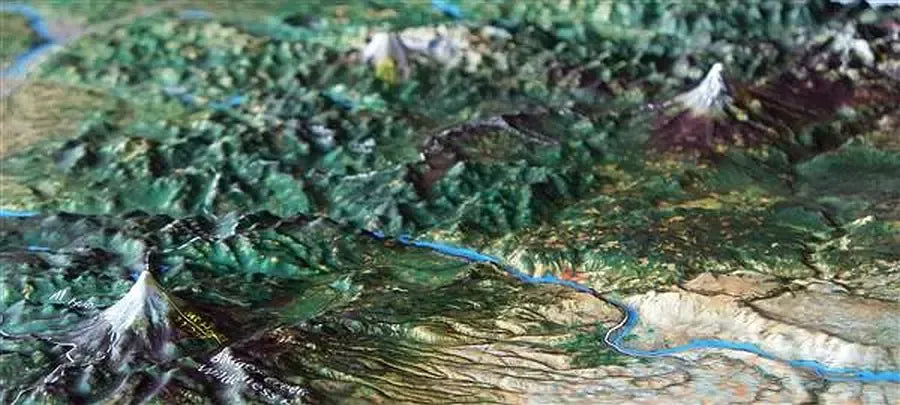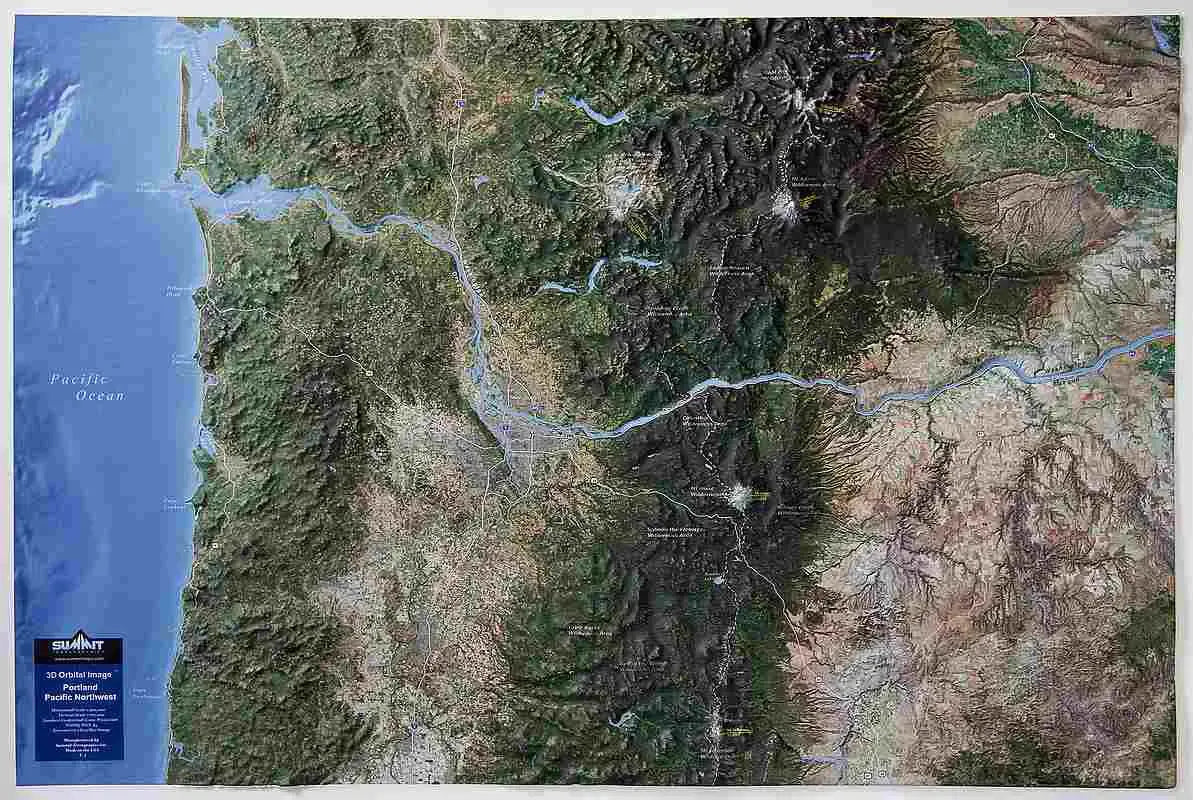 Portland Pacific Northwest Area Raised Relief Map Peaks & Ranges: This raised relief map highlights some of the most iconic peaks and ranges of the Pacific Northwest. Mount Hood, Oregon’s tallest peak, stands prominently to the east of Portland, showcasing its snow-capped summit and volcanic origins. Other notable mountains, such as Mount St. Helens and Mount Adams, are also visible, illustrating the powerful volcanic activity that shaped the region. The map accurately represents the Cascade Range, a dramatic volcanic arc that runs north-south through the area, defining the skyline and providing a stunning backdrop to the region’s lush forests and winding rivers.
