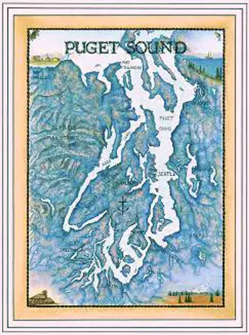 This hand illustrated 18.5" x 23.5" map of the Puget Sound is a great way to identify the various land and water features in the area...includes most of Whidbey Island and all of the South Sound, Hood Canal, Seattle and Lake Washington.
