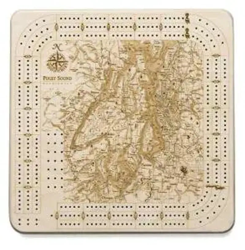 Immerse yourself in the beauty and topography of Puget Sound with the Puget Sound Wood Chart Cribbage Board—a game board that combines the thrill of cribbage with the detailed charm of a topographical map. As you navigate through the myriad points of interest in this stunning region, the Puget Sound Cribbage Board promises an engaging and visually captivating experience.