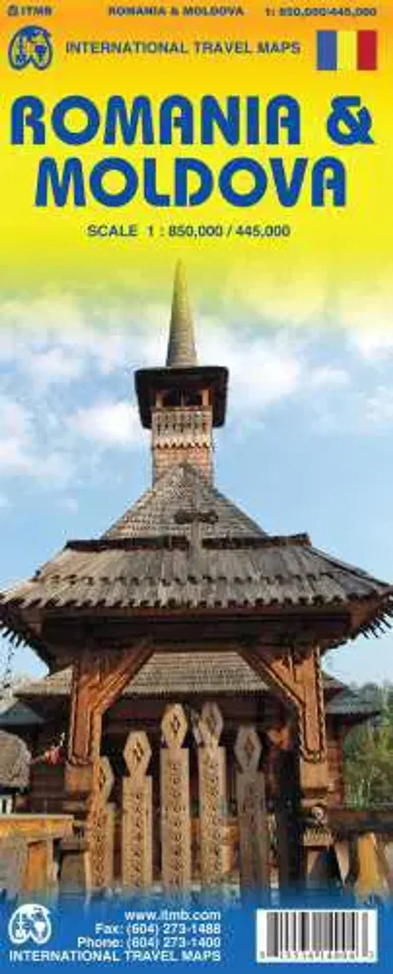 Detailed travel map of Romania & Moldova...up-to-date roads, place names, points of interest, border crossings, gas stations and shading for elevation. One side is a map of Romania at a scale of 1:850,000 and includes an inset of Bucharest. The other side is a map of Moldova at a scale of 1:445,000 making it one of the most detailed maps of Moldova! Includes an inset of the capital Chisinau.