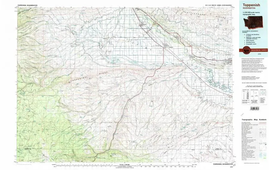 USGS 1:100,000 topographic map of Toppenish. This map scale is a good for getting a sense of the layout of a larger area of land - it shows an area of about 46 miles by 34 miles. It primarily shows natural features and contour lines, but it will also show towns, section, township & range and some roads.