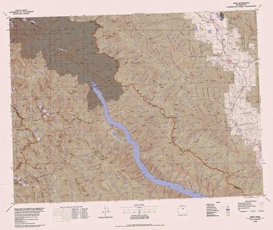 USGS 1:100,000 topographic map of Twisp. This map scale is a good for getting a sense of the layout of a larger area of land - it shows an area of about 46 miles by 34 miles. It primarily shows natural features and contour lines, but it will also show towns, section, township & range and some roads.