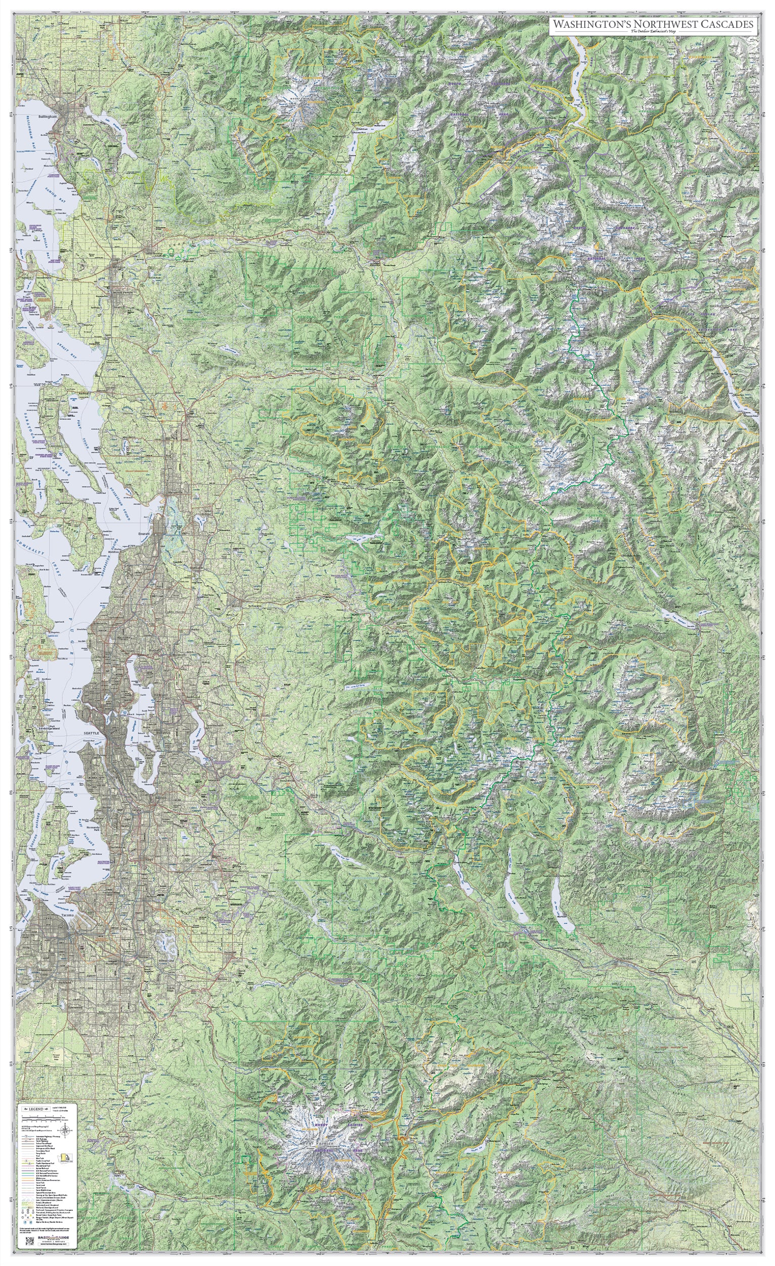 This map covers Washington State's Northwest Cascade Mountains from the Canadian border to Mount Rainier National Park, Including North Cascades National Park and the greater Seattle area.